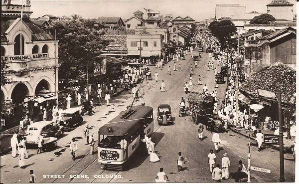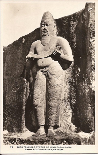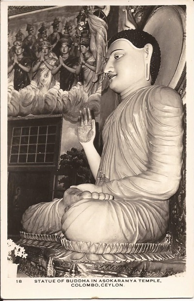 Four rare unposted postcards of Ceylon circa 1950 featuring: 1. A general greetings card displaying five different images ... 2. A Colombo street scene ... 3. Statue of King Parakrama Bahu ... 4. Statue of Buddha in Asokaramya Temple. All four postcards are in good condition.