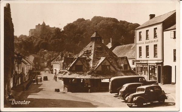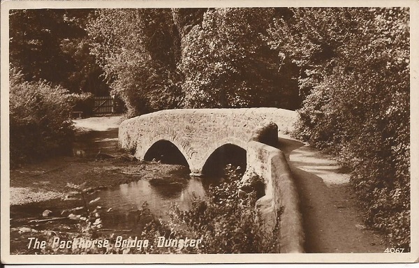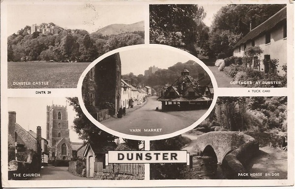 Three original unposted vintage postcards of Dunster, Somerset. Depicting: 1. Dunster Yarn Market ... 2. Multiple views of Dunster ... 3.The Packhorse Bridge. All three postcards are in good condition.