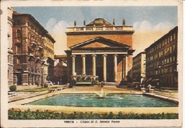 Four rare unposted postcards of Trieste, Italy depicting: 1. Chiesa di S. Antonio Nuovo ... 2. Pertici di Chiozza & Via C. Battisti ... 3. Riva ... 4. Riva Nasario Sauro. All four postcards are in good condition.